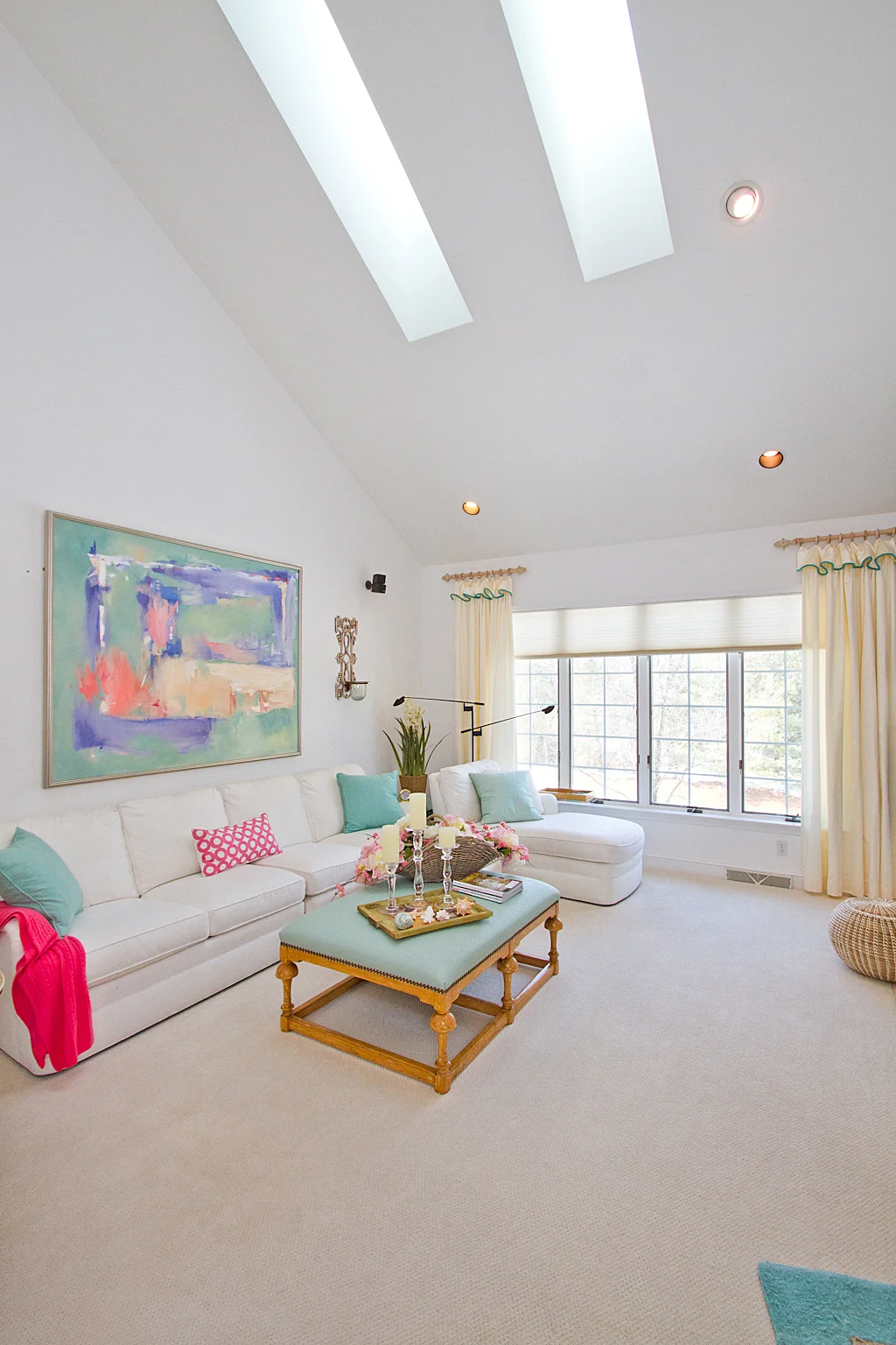 From the moment you step inside the front door of Sharon and Dave’s home, simplicity, elegance and cheerful colors will sweep you off your feet. Springtime and Coastal accent colors dance around the Family Room and invite you to come in and stay awhile. Natural light pours in from the sky-lights on the heigh ceilings of the Living Room and the fireplace brings a natural coziness to the atmosphere.